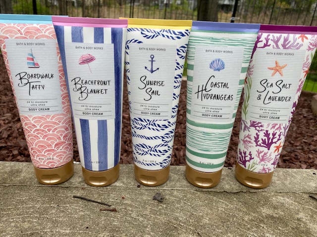 Bath & Body Works just released 5 new scents for Summer in a super fun costal packaging. The new scents are Boardwalk Taffy, Beachfront Blanket, Sunrise Sail, Costal Hydrangeas and Sea Salt & Lavender.