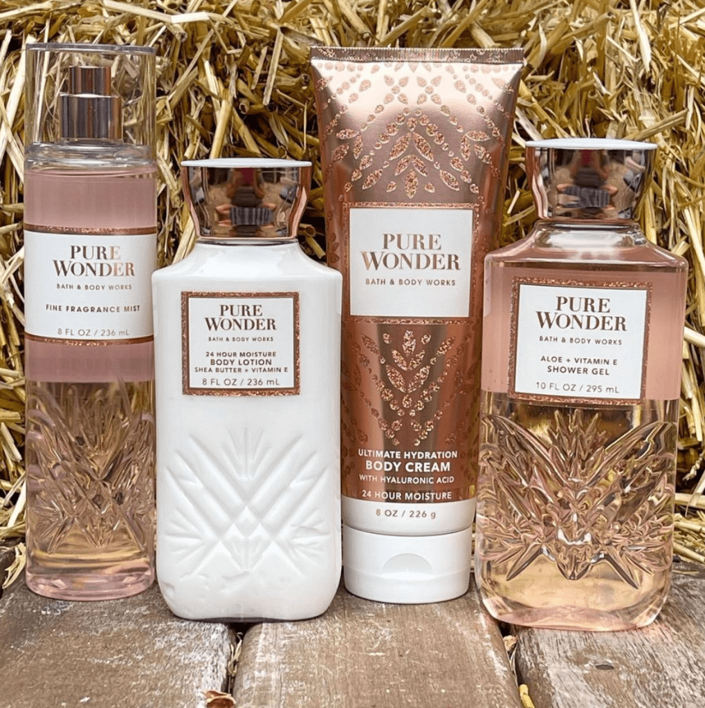 The scent notes for the new Bath & Body Works Pure Wonder collection are – iced rosé, star jasmine and warm white amber.