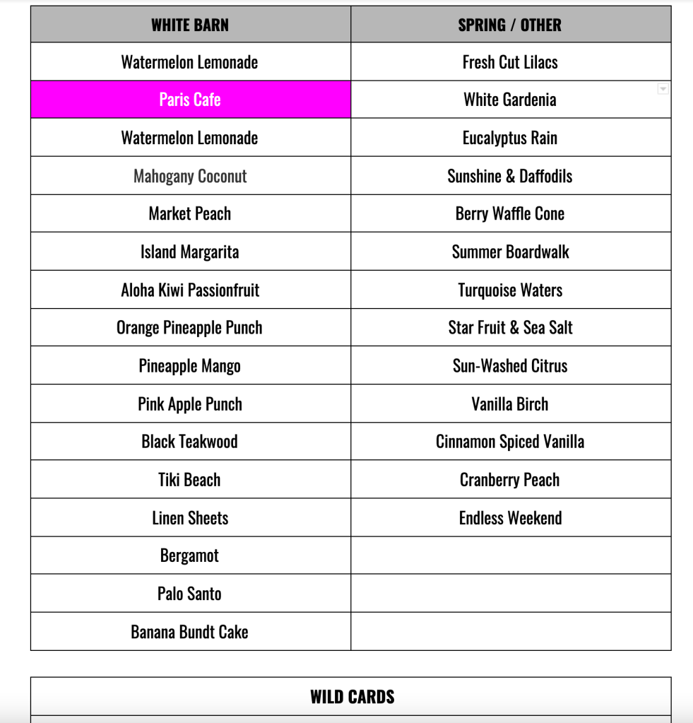 - Go Big! – You can create a more dynamic Candle Day Wish List using Google Docs. Set your page up in “landscape” format and use the “Table” funtion to create squares for each candle collection. Then color-code the candles you want to purchase. You can go a step further here and create a 3rd color for secondary choices.