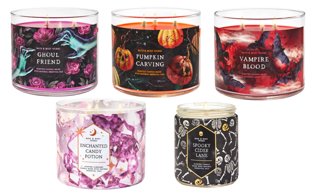 Halloween candles include Ghoul Friend, Pumpkin Carving, Vampire Blood, the NEW Enchanted Candy Potion and a Spooky Cider Lane Single Wick Candle.