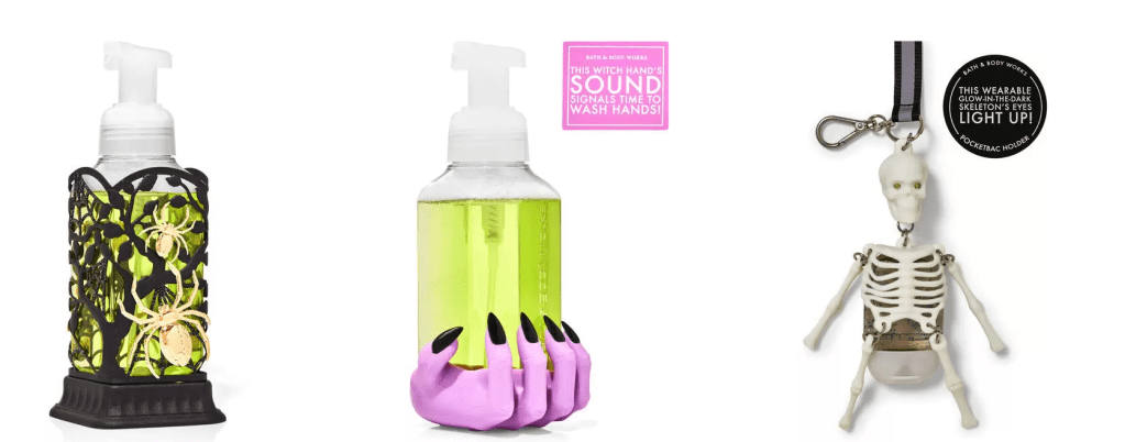 The Bath & Body Works Halloween theme includes cats, skulls, trees and spiders along with an elegant witch hand theme.