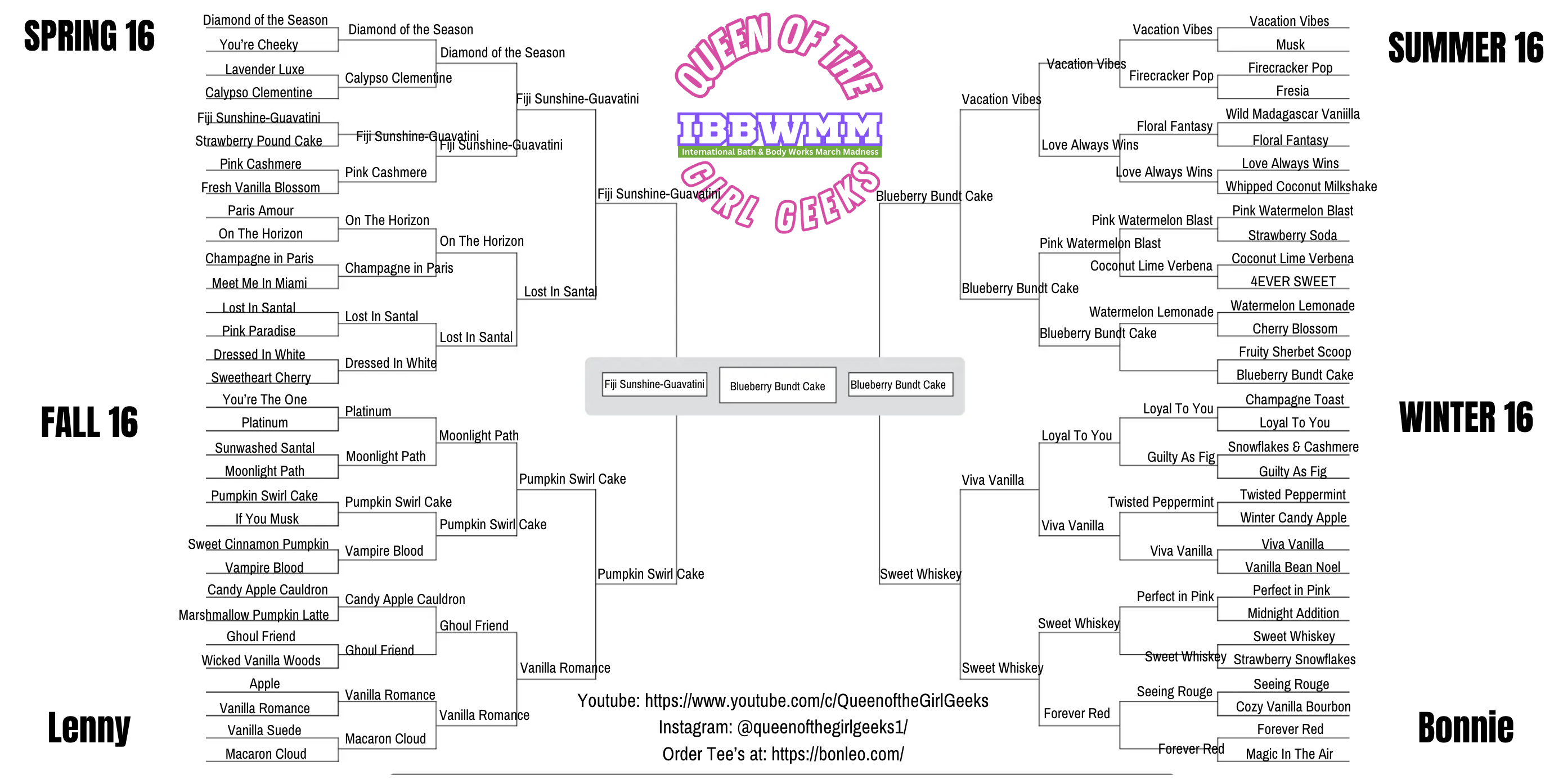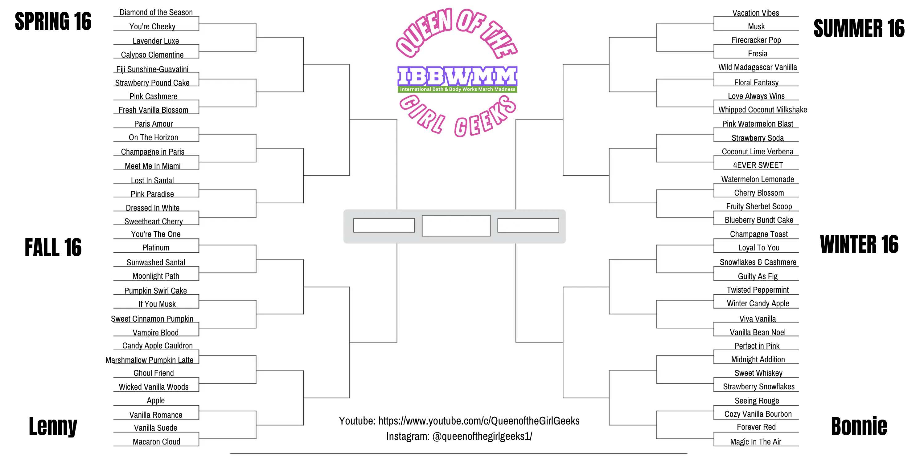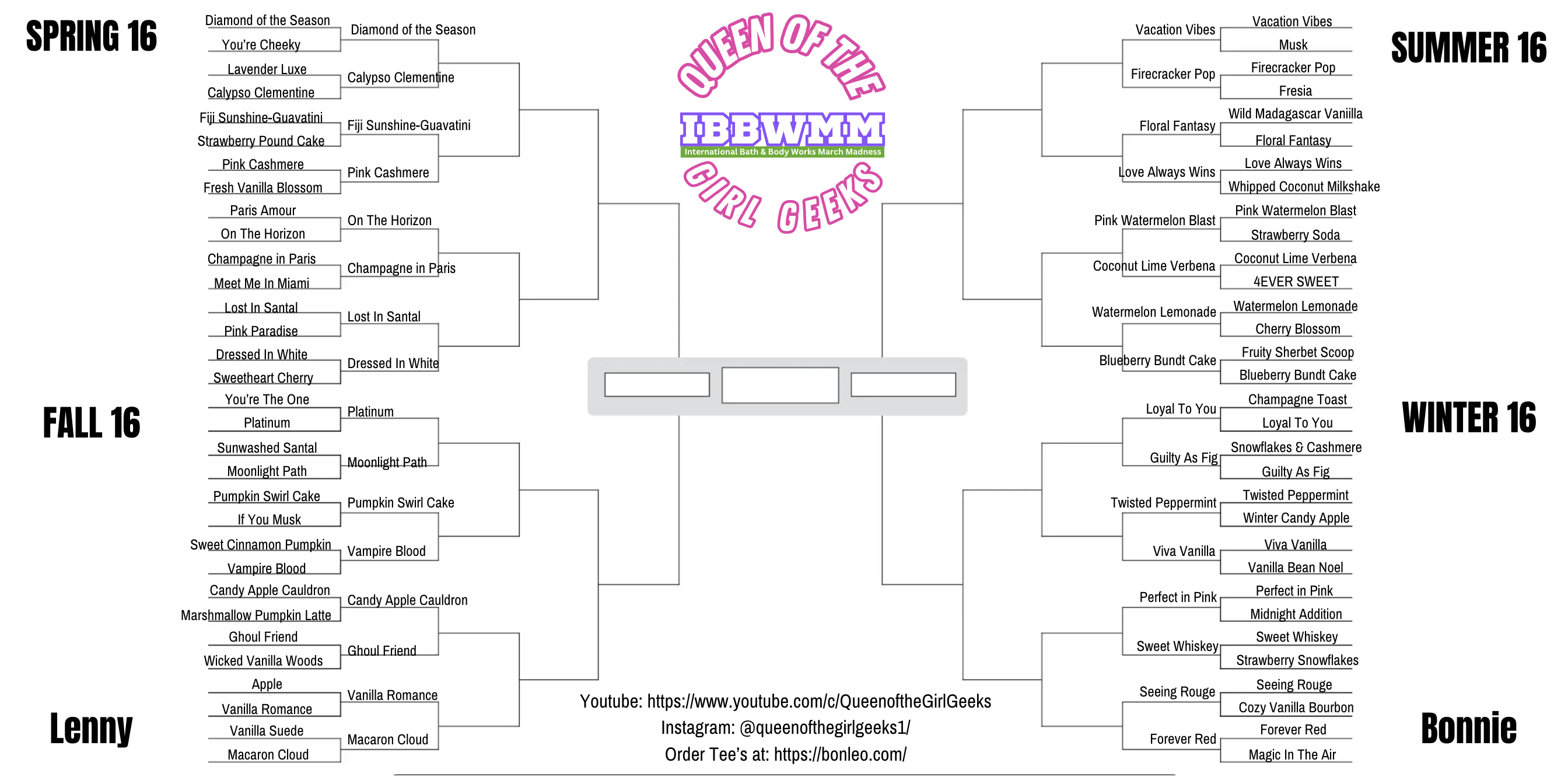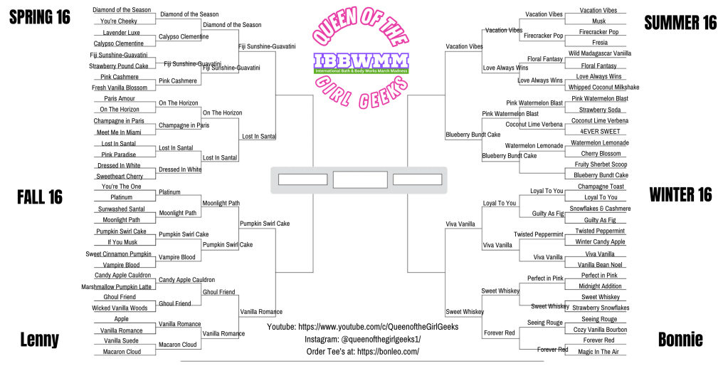 - Print the Queen of the Girl Geeks 2025 IBBWMM International Bath & Body Works March Madness Bracket and fill in your guesses by March 1st, 2025
