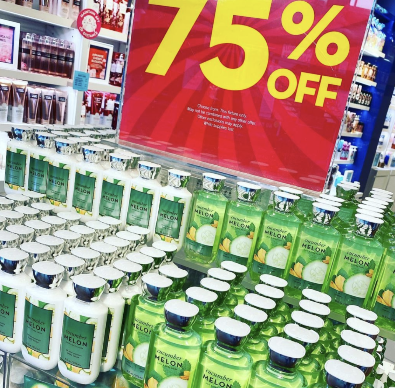 - Different Price Points – Bath & Body Works typically has a 50% off section and a 75% off section along with set prices like $3.99 and $4.99. It’s best to shop the 75% off sections as those will be sold out first. Note – Some store won’t have any 75% off sections until later in the sale.