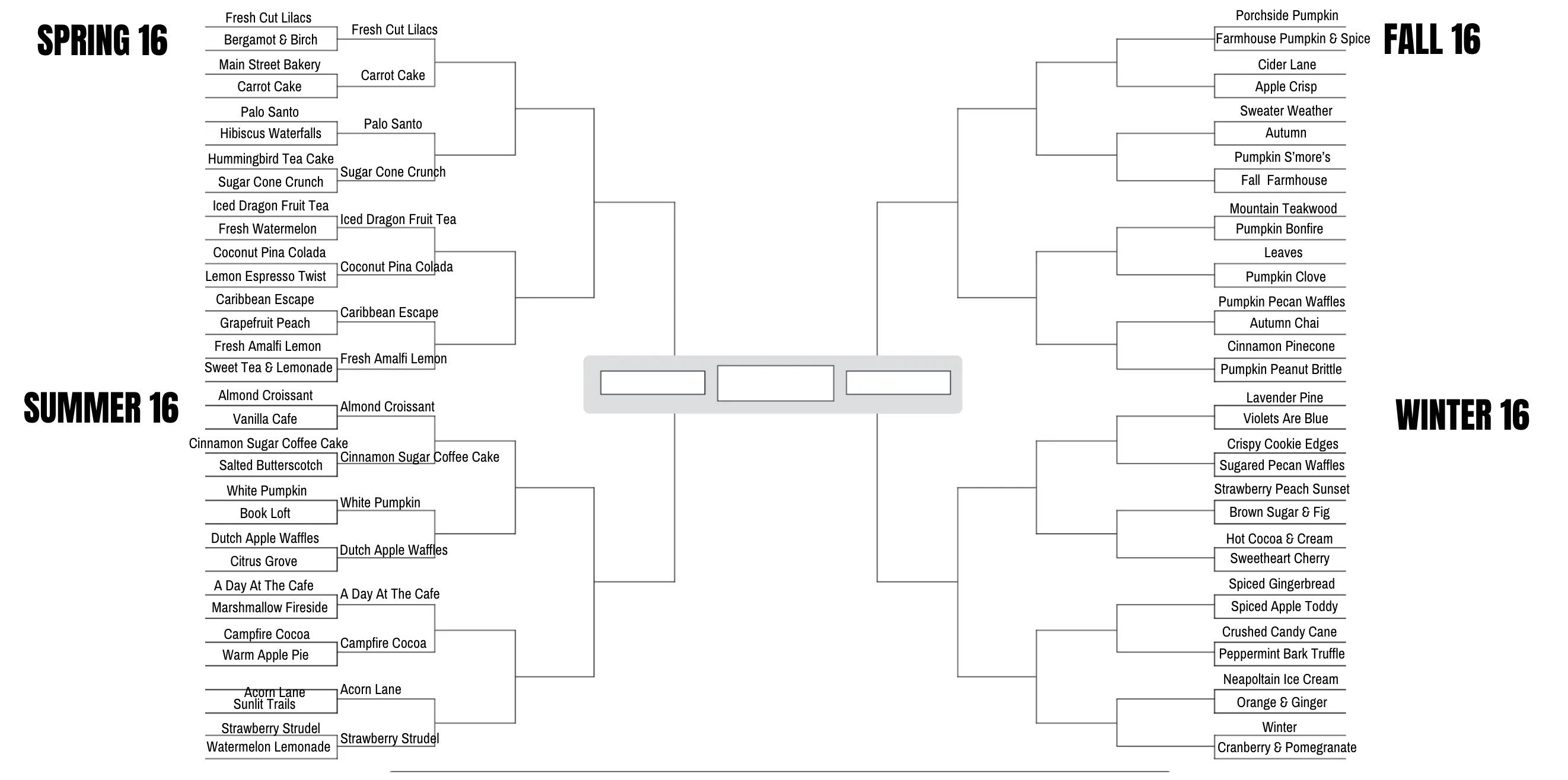 Below is the candle bracket that you can fill out with your choices. Pleas note that the top of every pair is considered a top contender by Bonnie & Lenny.