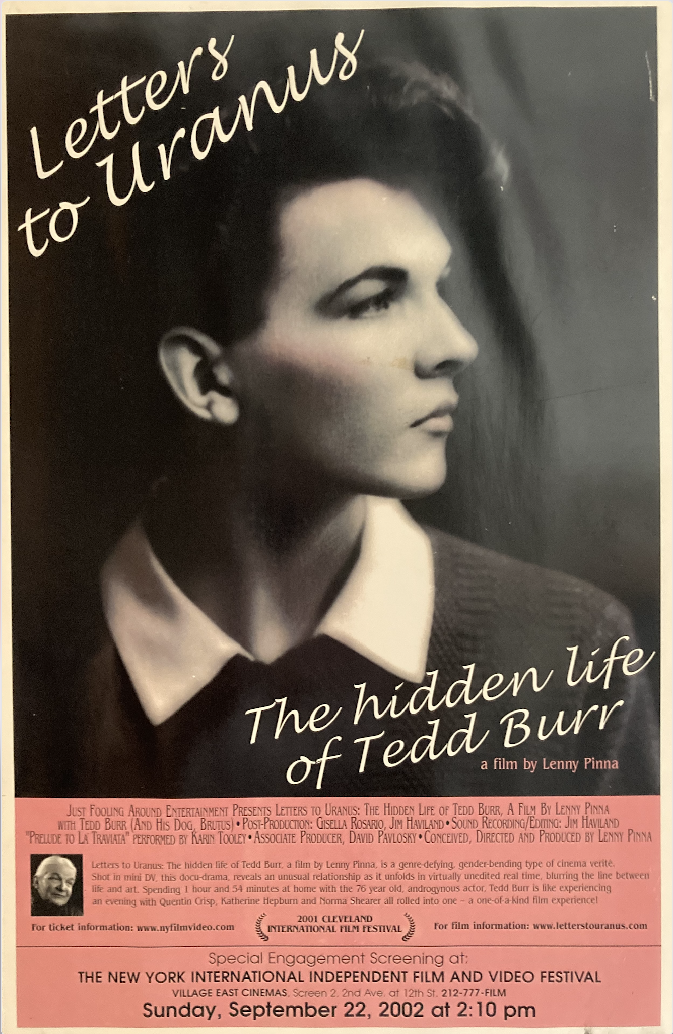 A 76-year-old androgynous man journeys through his past, revealing his early gender confused life. Letters to Uranus: The hidden life of Tedd Burr, a film by Lenny Pinna is a genre-defining, gender-bending type of cinema verité. Shot in mini DV, this docu-drama, reveals an unusual relationship as it unfolds in virtually unedited real time, blurring the line between life and art. Spending 1 hour and 54 minutes at home with the 76-year-old, androgynous actor, Tedd Burr is like experiencing an evening with Quentin Crisp, Katherine Hepburn and Norma Shearer all rolled into one. A one-of-a-kind film experience.